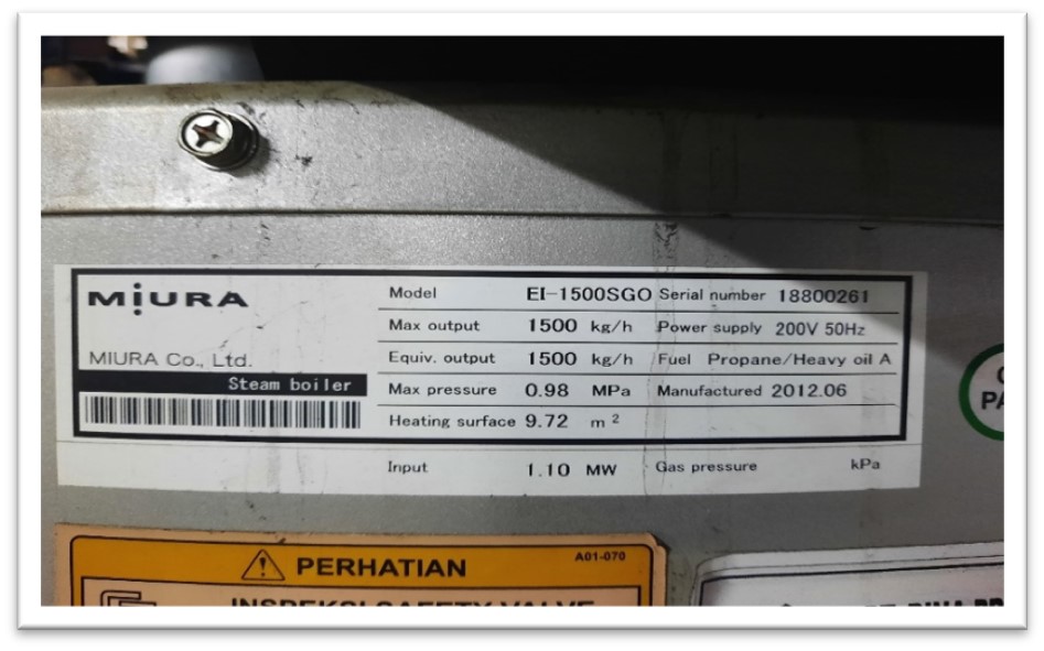Serial number: 18800261 | Max output: 1500 kg/h | Equiv. output: 1500 kg/h | Max pressure: 0.98 MPa | Heating surface: 9.72 m2 | Input: 1.10 MW | Power Supply: 200V 50Hz | Fuel Propane/Heavy oil A | *Removal cost will be borne by the buyer*